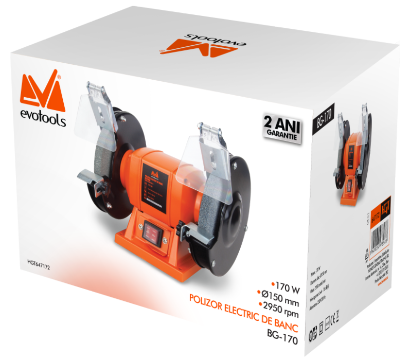 Polizorul electric de banc Evotools BG250 este un echipament compact și robust, conceput pentru operațiuni de șlefuire, ascuțire și debavurare în ateliere profesionale sau pentru utilizatori casnici. Motorul de 250 W asigură o funcționare stabilă, iar carcasa rezistentă oferă durabilitate pe termen lung.